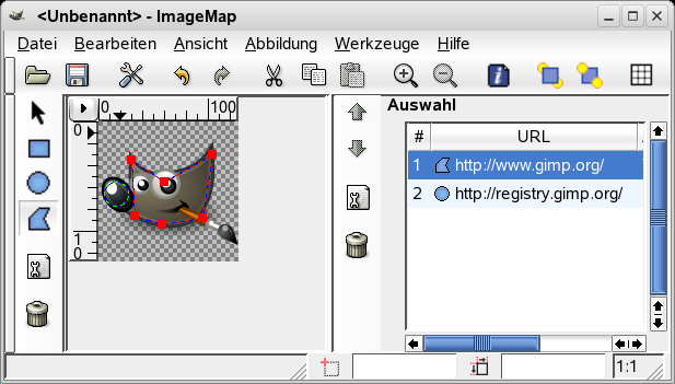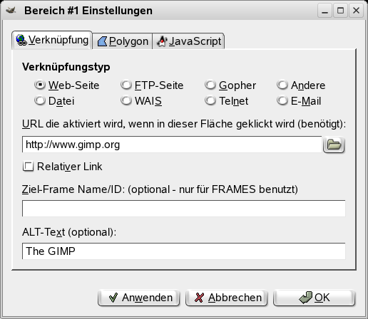 Im Internet werden häufig „klickbare“ Grafiken verwendet, bei denen Bildbereiche angeklickt werden können, was dann zu bestimmten Effekten führt. Typische Anwendung ist ein Link zu einer anderen Webseite, der durch einen Klick auf einen „verweis-sensitiven“ Bereich aktiviert wird. Dieses Filter ermöglicht es Ihnen, solche Bereiche in einem Bild auf ganz einfache Weise zu erstellen. Bei Programmen zum Webseiten-Design ist dies eine Standardfunktion, und mit GIMP funktioniert das ganz ähnlich.