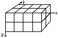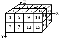 In der Informatik hat ein dreidimensionales (3D) Feld („array“) die Form „feld(x,y,z)“. Es ist leicht, sich ein zweidimensionales Feld vorzustellen: auf einem Blatt Papier ist es ein Feld mit Zeilen und Spalten: