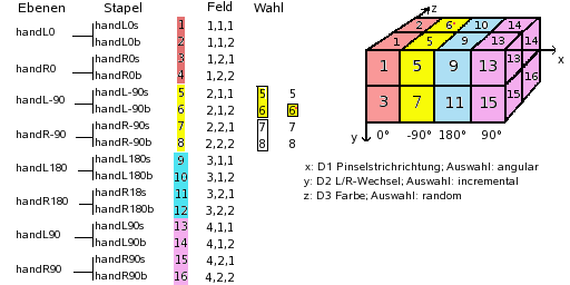 Die erste Frage, die wir uns beantworten müssen, ist die nach der Anzahl der benötigten Bilder. Wir reservieren die erste Dimension (x) für die Pinselrichtung (4 Richtungen). Die zweite Dimension (y) ist für den Links-/Rechtswechsel und die dritte Dimension (z) für den Farbwechsel. So ein Pinsel wird durch ein 3-dimensionales (4x2x2)-Feld repräsentiert: