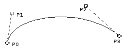 Die obige Abbildung zeigt eine Bézierkurve. Die Punkte P0 und P3 liegen auf dem Pfad, der durch Mausklicks erstellt wurde. Die Punkte P1 und P2 sind Griffpunkte, die automatisch von GIMP erzeugt werden, sobald Sie zwischen P0 und P3 auf die Linie klicken und ziehen. Sie verändern ihre Position, wenn Sie die Kurve biegen.