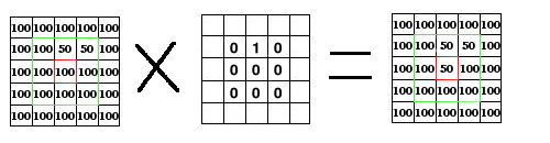 Was ist nun genau passiert? Das Filter liest, von links nach rechts, Zeile für Zeile alle Werte des Bereiches, auf das der Kern angewendet wird. Dabei werden die Werte der Bildmatrix mit den korrespondierenden Werten des Kerns multipliziert und die Ergebnisse addiert: (100*0)+(50*1)+(50*0)*(100*0)+(100*0)+(100*0)+(100*0)+(100*0)+(100*0)+(100*0) = 50. Das aktuell bearbeitete Pixel bekommt also den Wert 50.